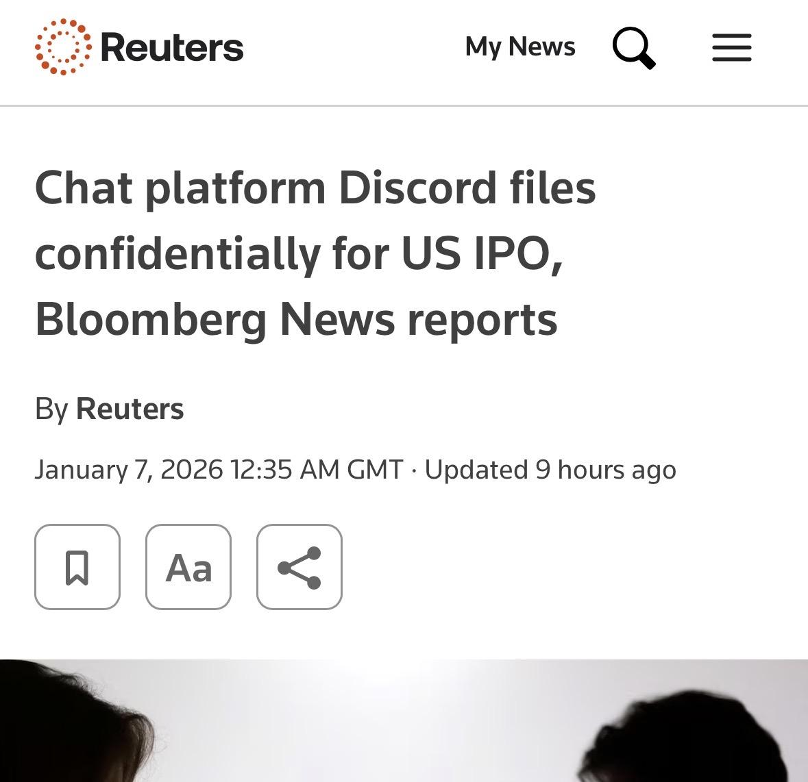 Start considering moving your communities out of Discord now. Don’t wait for the enshittiffication to arrive, the clock is ticking. No one will listen to me, but let’s talk again later. https://www.reuters.com/business/chat-platform-discord-confidentially-file-us-ipo-bloomberg-news-reports-2026-01-06/